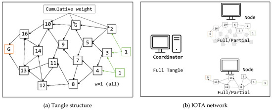 Figure 2b presents an example of the IOTA network. Two types of nodes exist in the network: coordinators and nodes. The coordinator employs the company itself, which serves as the main node that controls the Tangle’s integrity. Whenever a new transaction arrives, the coordinator executes the optimal algorithm to find the most suitable transactions for verification. Employing a coordinator node prevents the infinite verification of certain transactions and delayed conformations. This ensures that the performance of the system remains stable and reliable. Moreover, anyone can join the network as an ordinary node. When nodes inherit the Tangle database, they can copy either the entire or partial Tangle. When a partial Tangle is copied, only the necessary part is copied, which enables the writing of new transactions, as presented in the figure.