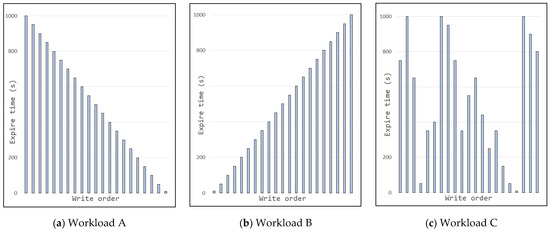 With the working simulation network, the subsequent challenge is preparing a suitable workload for evaluation. As the main claim of the D-Tangle implementation is enabling data deletions, workloads are also prepared accordingly. The immutable data type is not deleted from the network, and the insertion process is similar to that of other types. Therefore, the evaluation workloads focus only on unknown and finite data types. Three different workloads are prepared for the experiments, as presented in Figure 4. The first two focus on writing entries with a linear order deletion time. Workload C writes data with random deletions. The default configuration of workloads includes only finite data with predefined lifetimes. Subsequently, the proportion of unknown data increased linearly with respect to the workload. Thus, the specified percentage of the workload was inserted as unknown data, and the delete request was performed at the workload-defined time. This type of variable configuration helps observe the D-Tangle behavior in different scenarios with different lifetimes.