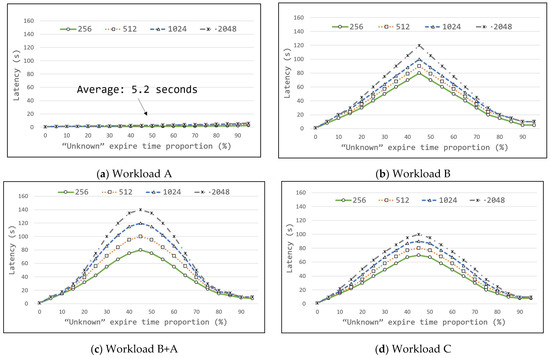 The results for the average deletion latency were recorded for all the workloads, as presented in Figure 5. Extensive evaluations are performed on each workload by increasing the unknown data percentage from 0% to 95%. The proportion of unknown data was distributed uniformly throughout the workload to ensure fairness in the results. The same scenario was repeated four times with different data sizes to further determine the differences in behavior. The workload was prepared using small-sized data, where each sampling had an average of 500 entries. The number of entries is configured accordingly to simulate a total workload of 256GB, 512GB, 1TB, and 2TB of data. Experiments with the same configuration were performed on all workloads and the integration of B + A for better conclusions. Figure 5a presents the results for Workload A. As the results confirm, D-Tangle achieves an almost instant deletion performance in this workload. Workload A focuses on deleting the data in decreasing order; thus, the subsequent item invariably verifies the leaf node. This proves that although the unknown data proportion increases, the last inserted data are deleted first invariably, thus avoiding any delay. Although the latency seems to increase linearly, forming an average delay of 5.2 s for all cases, the general results can be assumed as an almost instant delete performance. Therefore, Workload A can be considered the most suitable environment for the D-Tangle architecture for both finite and unknown data for any combination. Figure 5b presents the evaluation results for Workload B. The results formed a triangular view with the worst performance between 40% and 50% of the unknown data proportion. As Workload B is the opposite of Workload A, clearly, a longer latency exists in the evaluations. However, the latency decreases significantly when the proportion of unknown data increases up to 95%. Theoretically, it may seem that the latency should increase linearly. However, we should also consider that the results are based on the average of the entire workload. Indubitably, a small proportion of data have extremely long latency; however, the overall average decreases owing to a high unknown proportion. As the amount of unknown data increases, they do not verify each other, thus verifying only the immutable data. Moreover, a small chance exists that finite data will verify all the unknown data because the proportion decreases. Therefore, deletions can be performed faster in most cases.