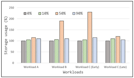 Additional results were recorded on storage usage to prove the effectiveness of the D-Tangle protocol. To demonstrate the storage cost and efficiency of the D-Tangle architecture, the following equation was used: database size/workload size × 100%. Ideally, the database size should always be equal to the workload size. In this case, storage usage would always be equal to 100%. However, owing to delays in the deletions, the database size may increase compared with the workload size. This is when the data are deleted from the workload but cannot be deleted from the database, owing to dependency delays. Figure 6 presents the overall results of storage usage based on the aforementioned criteria. Four workloads were prepared with two different workload configurations, C. As Workload C is a random workload, the delete request on the unknown data can be called anytime between intervals. Therefore, the configurations were made for the early and late calls of the deleted requests to observe more behavior. The results present almost constant storage usage (between 100% and 110%) for cases when the unknown data proportion is low or high. The worst performance was observed with a 50% unknown data proportion for Workloads B and C (with early deletion requests). However, when Workload C is configured such that the delete request is performed late relative to the finite data, the performance stabilizes even for a 50% proportion.