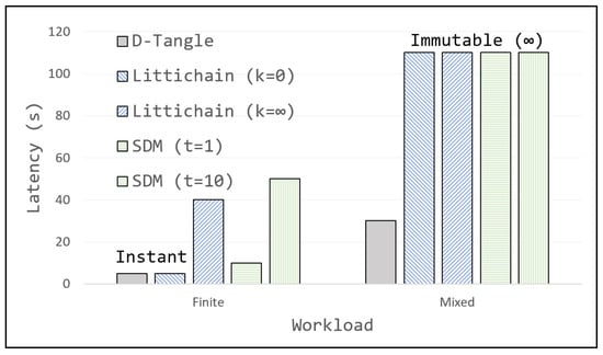 To prove the delete efficiency of D-Tangle over traditional blockchain-based approaches, more evaluations have been performed between D-Tangle, Littichain [29], and SDM [30]. As both Littichain and SDM performances change based on the predefined configuration, we have selected two instances from both projects with the difference configuration. For this, Littichain instances were selected with k = 0, which avoids maintaining the arrival time ordering and focuses only on expiration time ordering. Moreover, k = ∞ configuration keeps both arrival and expire time ordering on the blocks, which may create longer delays in deletion. On the other hand, SDM is focused on creating summary blocks in certain intervals. Therefore, creating a summary block after each new block (t = 1) is the best case in which SDM may perform in terms of deletion. The configuration with t = 10 is also taken for comparison as the default implementation. Considering the workloads, Littichain and SDM are focused on only finite lifetime workloads; thus, we have prepared two (finite and mixed) workloads with a random category from Figure 4. In the finite workload, only the finite-lifetime data is written, while mixed workload allows all finite, immutable, and unknown lifetime data. The evaluation results on deletion latencies are shown in Figure 7 below.