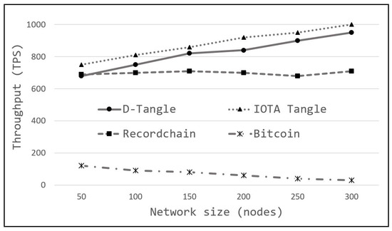 To evaluate the effect of the climb-up write technique on the transaction-write performance, more experiments were performed. For these evaluations, IOTA Tangle was selected as the parent architecture for the D-Tangle. For a better view, Bitcoin was also selected as the state-of-the-art instance of blockchain. As Bitcoin architecture is old and surely slow in data processing, Recordchain [15] was also selected as one of the late blockchain architectures that enhances the Bitcoin performance in IoT data environment. The evaluations were performed on the simulated network customized for each architecture requirement. The results are shown in Figure 8.