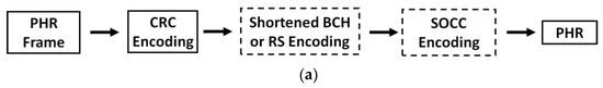 Figure 6a,b show a block diagram of the procedure for application on the error-correcting and error-detecting codes to the PHR and PSDU. Firstly, the CRC encoding of the PHR frame is carried out, and then whether to be encoded by the shortened BCH or RS code is determined. Next, it is determined whether to apply an SOCC. Similarly, the CRC encoding of the MAC header and MAC frame body is performed, and then whether to be encoded by the BCH or RS code is determined. In addition, whether to apply an SOCC is also determined. Hence, concatenated encoding with a BCH or RS code as the outer code and an SOCC as the inner code is carried out when those error-correcting codes are applied.