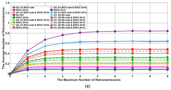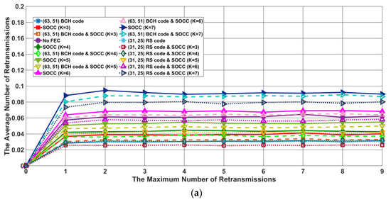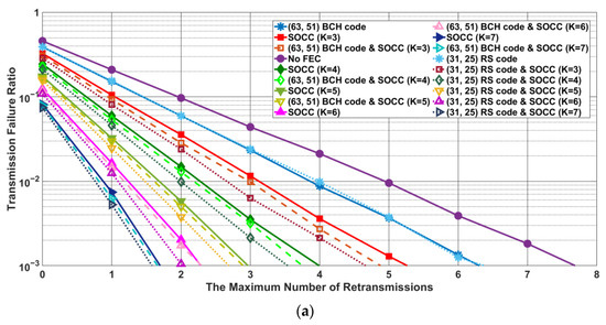 Moreover, the effect of BCH or RS coding in improving the transmission failure ratio and the average number of retransmissions is large. Especially, the best performance is obtained in the case of concatenated encoding using an SOCC with = 1/2 and an RS code. Hence, simply lowering the SOCC coding rate does not provide better performance. The reason is that miscorrections increase in frequency when decoding the SOCC in the case that the received power is insufficient.