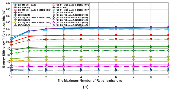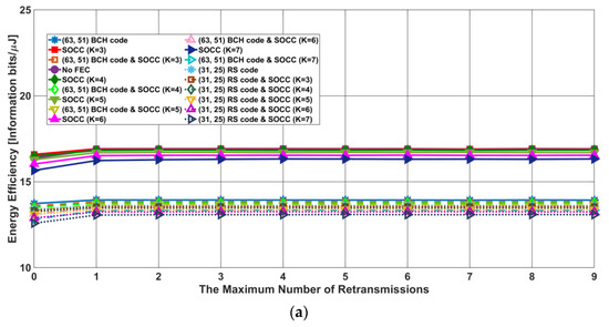 The energy efficiency is the highest in the case of encoding using only an SOCC with = 1/2. The performance is better than that in the case with no error-correcting encoding. This indicates that the increase in the error-correcting capability has a greater effect than that in the energy consumption for SOCC encoding and decoding. On the other hand, the transmission failure ratio and the average number of retransmissions improve while the energy efficiency decreases because of the increase in the number of redundant bits in the case that the BCH or RS code is concatenated with an SOCC. However, the difference in energy efficiency between concatenated encoding and non-concatenated encoding is about three information bits per at most, which is not large.