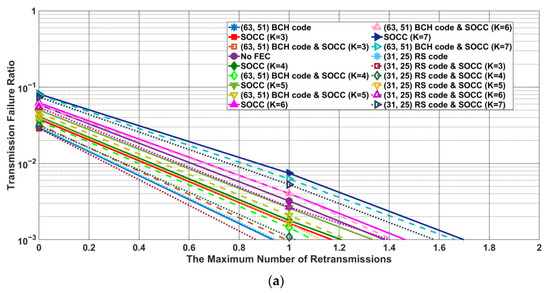 As the value of the SOCC increases, the transmission failure ratio and the average number of retransmissions improve because the error-correcting capability increases with decreasing . On the other hand, the energy efficiency decreases because the number of redundant bits in the is PPDU increased. Taking LD links as an example, it is necessary to set the maximum number of retransmissions to eight when error-correcting code is not applied, while the maximum number of retransmissions should be 4 when is 1/4, and that should be two when is 1/32 to achieve the transmission failure ratio of . On the other hand, the energy efficiencies are approximately 145, 85, and 20 information bits per when error correcting code is not applied, is 1/4, and is 1/32, respectively, under the above conditions. In a comparison of concatenated encoding with a BCH code and an SOCC against concatenated encoding with an RS code and an SOCC, the energy efficiency and average number of retransmissions are almost the same. However, the transmission failure ratio is more greatly improved by concatenated encoding with an RS code and an SOCC than by concatenated encoding with a BCH code and an SOCC because the error-correcting capability in the former case is larger. For example, in case that the link type is LD and = 1/4, the maximum number of retransmissions should be set to three when concatenated with the BCH code to achieve the transmission failure ratio of , while the maximum number of retransmissions may be set to two when concatenated with the RS code.