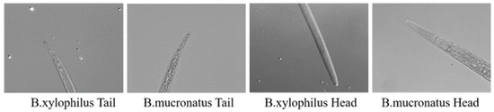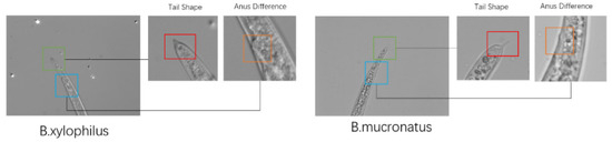 Bursaphelenchus xylophilus (B. xylophilus) is one of the most important harmful organisms to be detected in the entry–exit phytosanitary work. The annual economic losses caused by plant nematodes are more than 80 billion worldwide [1]. B. xylophilus is small, widely distributed, and harmful. The difference between B. xylophilus and other plant nematodes is very small, which is very difficult to distinguish [2]. Currently, the manual detection is still the main method [3]. As shown in Figure 1, the left is B. xylophilus which is harmful to vegetation, the right is Bursaphelenchus mucronatus (B. mucronatus) which is harmless to the vegetation. It can be found that the overall morphology and characteristics of these two nematodes are very similar and difficult to distinguish.
