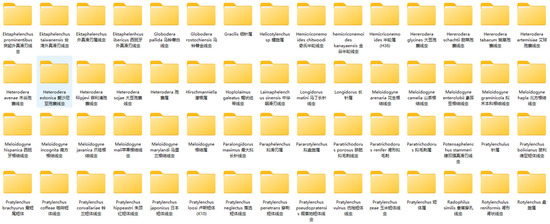 In this paper, we constructed the most abundant and diverse plant nematodes dataset that could be found. The dataset involves 24 species of nematodes that are easily confused with B. xylophilus. The total number of dataset images reaches 11,237. All images were taken uniformly with a Zeiss professional microscope Axio Imager Z1 with an objective magnification of 40× and a uniform image resolution of 1388 × 1040 [21]. As shown in Figure 3, it is a schematic diagram of the collected common different kinds of plant nematodes.