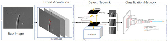 - Chen, L.; Strauch, M.; Daub, M. A CNN framework based on line annotations for detecting nematodes in microscopic images. In Proceedings of the 17th International Symposium on Biomedical Imaging (ISBI), Iowa City, IA, USA, 3–7 April 2020; IEEE: New York, NY, USA, 2020; pp. 508–512. [Google Scholar]