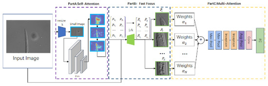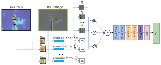 Based on Section 2.2.1 and Section 2.2.2, the original plant nematodes image is input, the image block {P1, P2,..., PN} containing the key feature areas of the plant nematodes are obtained by the Self-Attention feature network and the small-scale fast focus module, where N is the number of blocks. For different areas blocks, the matrix weight αn is related to the average brightness ratio of the corresponding heatmap areas. After multiplying the obtained feature areas block PN with the corresponding weight αn, they are fed into the classification convolutional neural network. The specific process is shown as follows Figure 12.