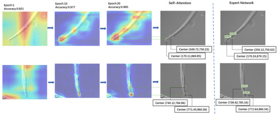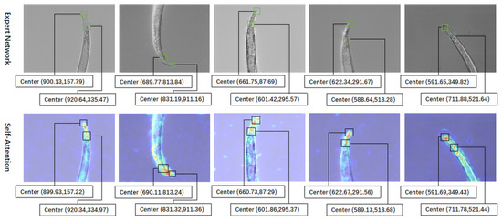 The Self-Attention network used in this paper further improves the detection accuracy while effectively saving the size of the network model, and the key feature locations output by the neural network match well with the expert experience. As shown in the Figure 14 below, the deviations of the coordinate positions calibrated according to the expert experience are compared with the coordinate positions of the key feature centers output by the Self-Attention network. It can be seen that the key feature positions judged by the Self-Attention network are in good agreement with the expert experience, and the average error rate of the calibrated x and y axis coordinates is only 0.552%.