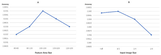 Experimental results of different down-sampling times and different feature areas size. (A) Feature Area Size; (B) Input Image Size.