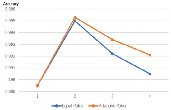 where represents the whole rectangular box, and are custom variable parameter. The experimental results with different area sizes and down-sampling times are shown in Figure 11A below. It is verified that the best recognition results are obtained when and , that is when the feature area of 100 × 100 is intercepted on the original high-resolution image. At the same time, we gradually increase the down-sampling times. When down-sampling once, both accuracy and efficiency can be taken into consideration. Then, the accuracy will decrease significantly as the down-sampling times increases. The following picture shows the comparison results of detection accuracy under different down-sampling times and feature areas sizes.