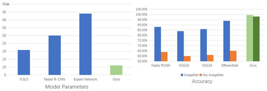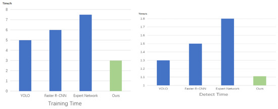 From the experimental results in Figure 15 and Table 3 above, it can be concluded that based on the method in this paper, we avoid the tedious processes of extensive manual labelling. We improve the average training time of the model by more than 50%, reduce the testing time of a single sample by about 27%, optimize the model size by 65%. The detection accuracy of the ImageNet pre-trained model is improved by 12.6%, and the detection accuracy of the no-ImageNet pre-trained model is improved by more than 48%.