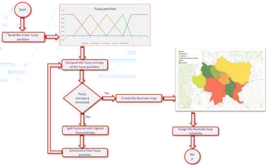 Then, the fuzzy entropies of each fuzzy set are measured and the fuzzy entropy of the fuzzy partition is computed. If it is less than or equal to a prefixed threshold, the algorithm stops, and the thematic map is constructed assigning to it a reliability measure, a function of the fuzzy entropy of the fuzzy partition. Otherwise, the fuzzy partition is reconstructed, splitting the fuzzy set having the highest fuzzy entropy to form two fuzzy sets; then, the fuzzy entropies of all the fuzzy sets are recalculated; this process is iterated until the fuzzy entropies of the fuzzy relation are less than or equal to the threshold.