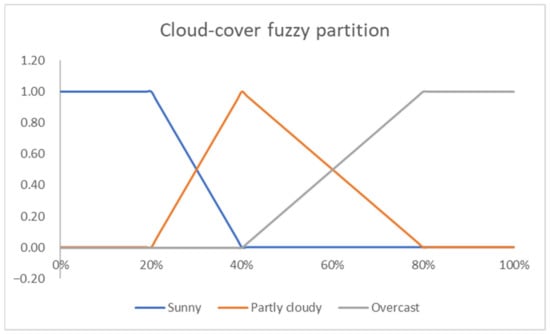 Fuzzy numbers can be used to construct fuzzy partition. As an example, let x be a variable representing the percentage of cloud cover in a day. The universe of the discourse X is given by the interval [0%, 100%].