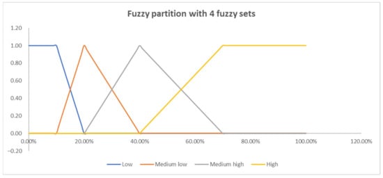 Example of fuzzy partition of the domain [0%,100%] with 4 fuzzy sets.