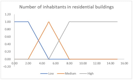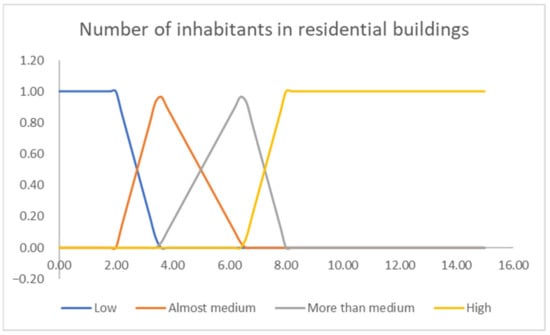 The thematic map of the number of inhabitants in residential buildings using the initial fuzzy partition.