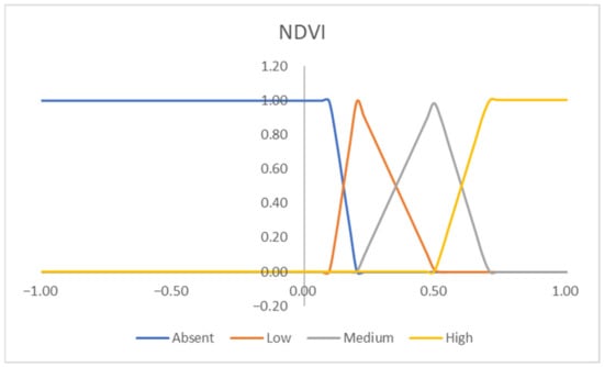 The initial fuzzy partition of the NDVI index given by 4 fuzzy numbers.