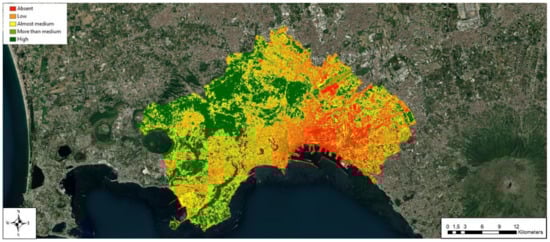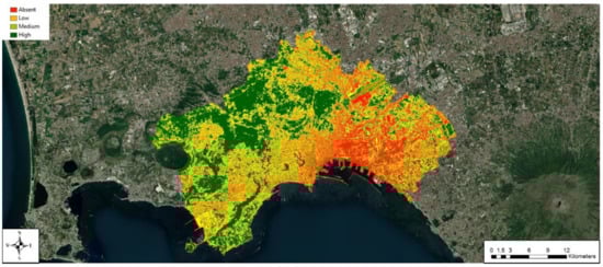 Now, we show the results of another test executed to obtain a thematic map of a spatial image dataset. It is given by a 1 m × 1 m remote sensing image dataset of the Normalized Difference Vegetation Index (for short, NDVI) obtained in June 2022 by the Sentinel 2 satellite on the study area of the municipality of Naples (Italy).
