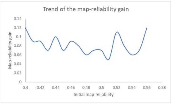 In Figure 18 is shown the trend of the map-reliability gain with respect to the map reliability of the initial thematic map, obtained by measuring the map-reliability gain in all tests.