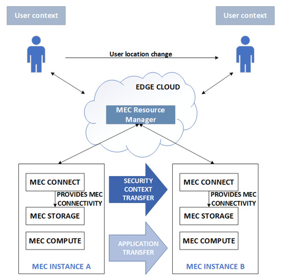 From the end user’s point of view, mobile network services use resources in the cloud. The user is interested in the quality of the service guaranteed in the contract with the service provider and the service continuity of operation. Service providers use edge servers and Multi-access Edge Computing (MEC) technologies to ensure the quality of service [1]. User mobility requires service providers to follow the client with the service edge location, thus transferring user data, including security-related data, between edge servers. The support for user mobility has its roots in 2G roaming and handover procedures [2,3]. These services work daily with already deployed mobile networks with proven scalability and reliability. However, these solutions cannot be easily implemented in a generic MEC-based architecture.