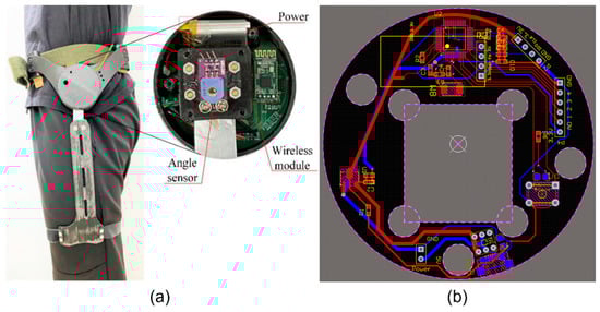 (a) Wearable hip gait collection device. (b) Circuit design of the collection system.