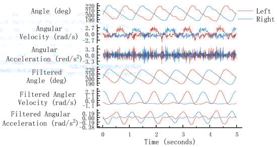 The experimental data were transmitted to the computer through the built-in circuit of the hip joint device in real time, and the computer client displayed diagrams of the left and right hip joint angle changes. The collected gait information of the subjects contained high-frequency noise, which was filtered out with a 20 Hz Butterworth filter. The first and second derivatives of the angle signal are the angular velocity and angular acceleration data, respectively, of each signal (Figure 5). The experimental data were labeled with the corresponding fatigue level 0–4 and reported by exercise intensity level.
