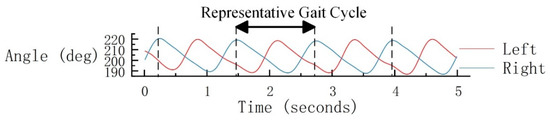 The most popular gait segmentation algorithm at present is based on the peak detection algorithm, which has high feasibility and is strongly dependent on the data. It can segment the gait cycle but cannot detect the type of human movement. In this study, the dynamic time warping (DTW) algorithm was used to divide the gait cycle not only to achieve higher accuracy of gait segmentation than that achieved with peak detection but also to identify the type of subject movement [23]. The DTW algorithm first constructs a sequence template of the process of motion, then the matching distance is calculated by matching the signal with the template and, finally, the local minimum value of the matching distance is selected as the starting point and end point for gait segmentation [24]. This study used a sequence from one heel strike to the next heel strike as a representative gait cycle (RGC). In the experiment, only the gait information for walking was collected, and there was no need to recognize gait type. The hip joint angles were segmented simultaneously using the signal of the right hip joint as a reference. After segmentation, the length of an RGC is different, which causes problems for subsequent machine learning. In this study, the data were normalized by length, and an RGC was represented by a 150-point sequence. Figure 6 shows the sequence of the hip joint angle over time, and the start of the RGC is defined as the time when the right heel touches the ground [25]. The angle represents the angle between the subject’s thigh and the back of the body.