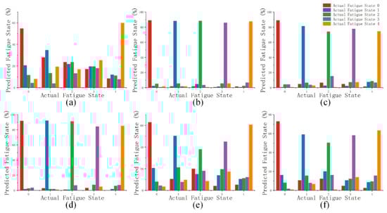 Figure 7 shows the distribution of predicted states from various models. Although the logistic regression model showed the worst performance assessment in predicting fatigue levels, it performed well in predicting fatigue level 0 and fatigue level 4. This model can be used for binary detection of fatigue and non-fatigue. Other models indicate that the number of error samples decreased as the distance between the actual state and the predicted state increased.