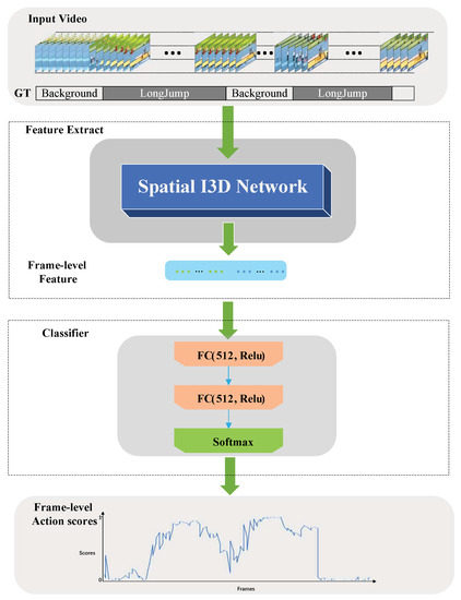 As mentioned earlier, C3D and R-C3D are faster, but their accuracy is slightly lower on a video data set such as UCF-101. The features extracted with them will lead to insufficient understanding of the video and will affect the accuracy of the entire action evaluation network. Because the modules in this paper are used for precise adjustment of timing boundaries, this paper hopes to obtain more effective video features, such as I3D [21], MF-Net [44], TSN [11], and other video understanding models. As mentioned above, the I3D network is the best performing network on the UCF-101 data set, which means that the extracted features are most effective for video understanding. Therefore, this paper also uses an I3D network as the feature extraction network.