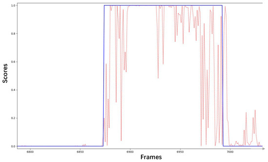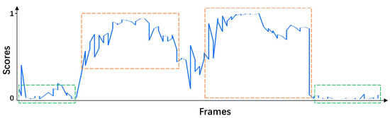 Since the final output is a probability of actions, it is necessary to limit the output to the interval [0, 1]. Therefore, the final output is normalized using the sigmoid function, as shown in Equation (1), where is the final action score, and is the network output. After that, the action scores of each frame are smoothly connected. Finally, a continuous action score curve is obtained. As shown in Figure 2, the horizontal axis is the frame number, and the vertical axis is the action score.