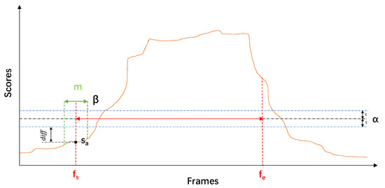 When analyzing the action score curve of a video, the segment containing the action instance is intuitively the portion of the curve that reaches a continuous high score, as covered by the orange dashed box in Figure 2. The background is the continuous low score part of the curve, as covered by the green dashed box in Figure 2. The timing boundaries of this section are between the orange dotted frame and the green dotted frame. As can be seen from Figure 2, the action scores predicted by the network are still subject to certain disturbances. This section presents a robust and effective strategy to locate the boundaries.