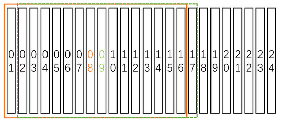 The video is first sampled at a rate of 25 frames per second, and then the TV-L1 algorithm [46] is used to extract the optical stream of the video. Therefore, the feature information of the nth frame in the video can be expressed as , where represents the optical flow information of the nth frame. When using the I3D network for feature extraction, since the original I3D is 16 frames without repeated downsampling, the motion evaluation of the frame level of this paper cannot be satisfied. Therefore, the sampling mode of the I3D network needs to be modified. After modification, the sampling window length is 16 frames, the initial sampling frame of the nth frame feature extraction, and the sampling frame fe is ended. Insufficient start and end are supplemented by blank frames. The sampling diagram is shown in Figure 4. A black rectangle represents a video frame, and a number within a rectangle represents the serial number of the frame. The orange solid rectangle indicates the feature extraction sampling frame of frame 8. The green dotted rectangle indicates the feature extraction sampling frame of the ninth frame of the next frame.