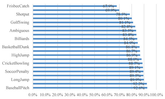 For the performance of the motion evaluation network, THUMOS14 is trained with the timing tag verification set, the training accuracy can reach 92.1%, and the test accuracy is about 79.6%. Figure 5 shows the action score curve output by the motion evaluation network test sample, where the solid blue line is the real label, and the red dotted line is the predicted value. Figure 6 shows the accuracy of the classification of each category in the verification set based on the action assessment network score.