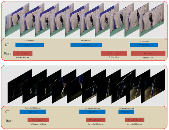 Qualitative examples of the predictions of our network on the THOMOS’14 data set. The blue mark is the ground truth, and the number indicates the start and end time of the action. The red mark is the prediction result, which shows not only the start and end times of the forecast but also the confidence (each scaled by a factor of 10×) of the prediction.
