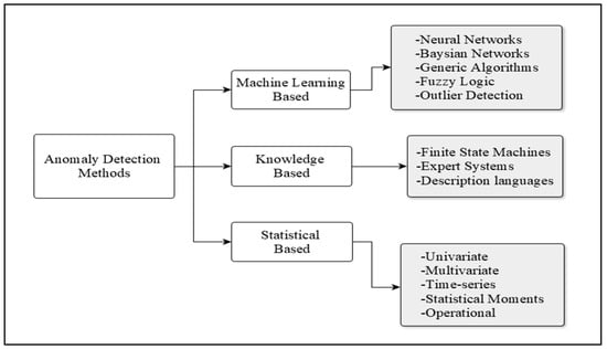 There are different types of approaches for developing Sig-IDS and Anom-IDS. As shown in Figure 1, knowledge-based or statistical-based methods and deep machine learning are the Anom-IDS-built approaches. Statistical metrics such as the median, mode, mean, and standard deviation are used for the statistical-based approach. Models for the same are Univariate, Multivariate, and Time-series models. For a knowledge-based approach, a set of rules is created using human knowledge. Finite State Machines, Description languages, and Expert Systems are examples of Knowledge-based IDS. The machine learning approaches can be categorized into supervised, semi-supervised, and unsupervised learning. Supervised learning uses labeled input data for training, whereas unsupervised learning uses unlabeled input data for training. Semi-supervised learning uses some labeled data and a vast number of unlabeled input data for training [3,4,5].