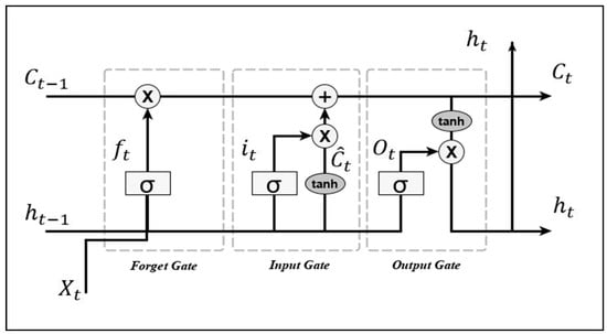 Here, ‘’ is a representation of the output gate, whereas the notation ‘ht’ denotes the final status of short-term memory information. The weights in Equations (4)–(6) and Equation (8) are updated using backpropagation through time (BPTT) based on the difference between actual and output values. Hence, using this highly flexible gate structure, LSTM can combat the vanishing and exploding gradient problem of RNN [30].