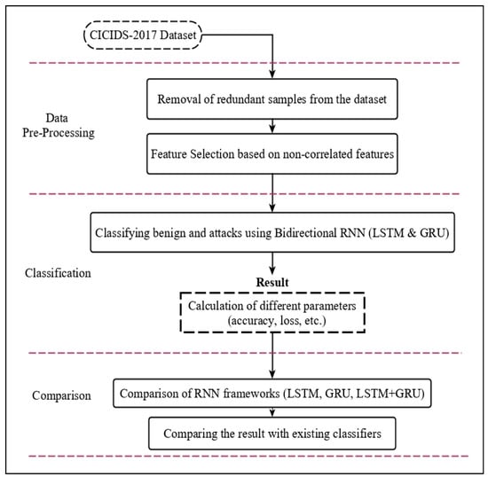 This section manifests the key components of our proposed work, namely the Feature Selection method and the Bidirectional RNN model. Figure 5 shows the complete procedure of the work in three stages, namely data pre-processing, classification, and comparison. Data pre-processing includes the removal of redundancy and selecting the optimum feature set. The second stage consists of the classification of the data and the calculation of various parameters. Finally, the third stage is the comparative results of the proposed model with other recent algorithms. These three stages are subsequently discussed in Section 4.1, Section 4.2 and Section 5.2.