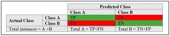 To assess the effectiveness of the recommended design, we have applied several performance metrics for each sub-dataset. The final result of the model is the confusion matrix. A confusion matrix is a useful metric to analyze how precisely the model identifies the instances of different labels. Figure 6 shows the diagram of the confusion matrix. Precision and Recall are the most common metrics used to evaluate deep learning models. Precision is the ratio of correct or incorrect learning predictions, whereas Recall is the proportion of the percentage of positive matches found to the total number of positive matches. These metrics are formulated as follows [39,40,41].