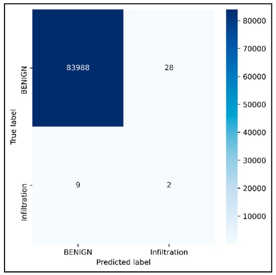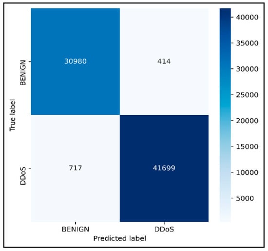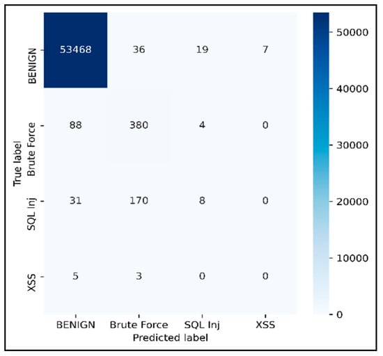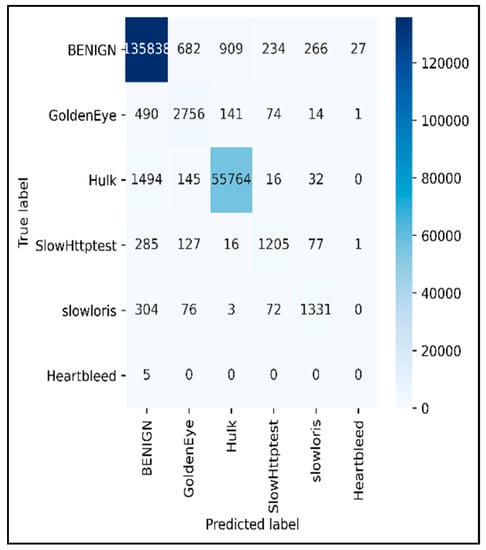 The CICIDS-2017 dataset contains 77 features, as listed in Table 2, and around two million samples. Removing correlated features and redundant samples from the dataset allowed the model to work more efficiently. The metrics of performance are calculated from the confusion matrix. The rows of the matrix represent the actual samples of classes and the column represents the predicted samples of the classes. The True Positive (TP) metric of the Tuesday dataset is the values located diagonally in the matrix, i.e., (137, 097, 1917, and 1055). A large True Positive shows that the model has a high classification rate, whereas True Negative samples are samples inaccurately classified by the model. Similarly, other metrics are calculated from the confusion matrix using their respective formulas discussed in Section 5.1.