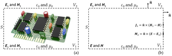 Using the surface equivalence theorem, the actual arbitrary EMI source is replaced by an equivalent source that produces the same electromagnetic fields in the region of interest. An arbitrary EMI source, such as the printed circuit board (PCB) shown in Figure 1a, is considered. The assumed PCB in Figure 1a radiates electric and magnetic fields E1 and H1. A closed surface S, which, in general, can have an arbitrary shape, encloses the assumed PCB, as shown in Figure 1a. The volume within the surface S is denoted by V1 and the volume outside the surface S is denoted by V2. Note that in this paper, without loss of generality, the surface S is assumed to be a rectangular cuboid. This makes it easier to capture the tangential components of the electric and magnetic fields in both numerical simulations and experimental measurements.
