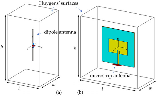 Figure 2a shows a dipole antenna designed to operate at 1 GHz. The length, radius, and excitation gap of the dipole antenna are 136 mm, 2.5 mm, and 20 mm, respectively. The dipole antenna is enclosed by a Huygens’ surface with dimensions l × w × h, where the center of the dipole antenna coincides with the center of the cuboid, forming the Huygens’ surface. The dipole antenna is assumed to be a perfect electric conductor (PEC). A discrete port with a length of 20 mm is used to excite the dipole antenna from its center. To reproduce the results presented in this paper, the CST-MWS input file (dipole_antenna_01.cst) is provided in the Supplementary Materials attached. Figure S1 shows the dipole antenna scattering parameter S11 calculated by way of the CST-MWS software using both the time domain finite integration technique (FIT) [17] and the finite element method (FEM) [18].