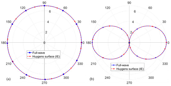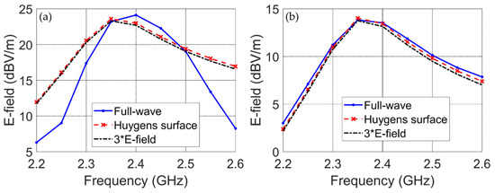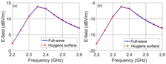 To evaluate the performance of the equivalent Huygens’ surface, 2D cut planes at = 0 and = 90 at 10 m distance are shown in Figure 6a,b, respectively. The maximum absolute difference between the calculated electric field using the full-wave method and the equivalent Huygens’ surface method is −26.02 dB (0.05 V/m) and −27.97 dB (0.04 V/m) in the = 0 and = 90 cut planes, respectively.
