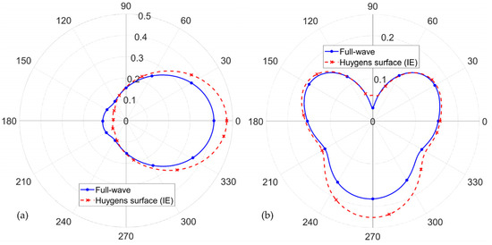 The radiated electric fields in two two-dimensional (2D) cut planes, = 0 (xoz plane) and = 90 (xoy plane), according to Figure 2a, are shown in Figure 4a,b. It can be seen that the results obtained by the equivalent Huygens’ surface method are in excellent agreement with the results obtained using the full-wave IE solver.