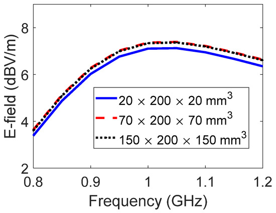 To show the impact of the Huygens’ box size on the calculated results, three different boxes with dimensions of 20 × 200 × 20 mm3, 70 × 200 × 70 mm3, and 150 × 200 × 150 mm3 are considered. Figure 7 shows the radiated emissions for these three box sizes. Although the Huygens’ box cross-section increases approximately by a factor 4 in each case, the radiated electric field does not change significantly.