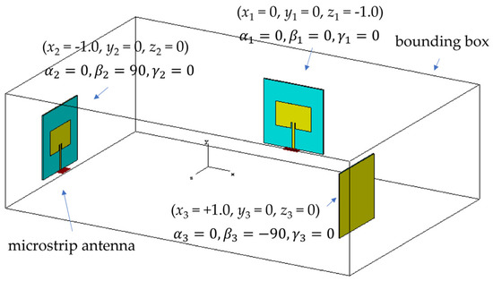 For example, Figure 8 shows an arrangement for three microstrip antennas. The location vector (xi, yi, zi) and orientation vector () for each microstrip antenna are also shown in this figure. This example illustrates that by changing the position and orientation vectors, any configuration involving multiple devices can be easily constructed. Note that the number of EMI sources and their location and orientation vectors can be selected arbitrarily without any limitation.