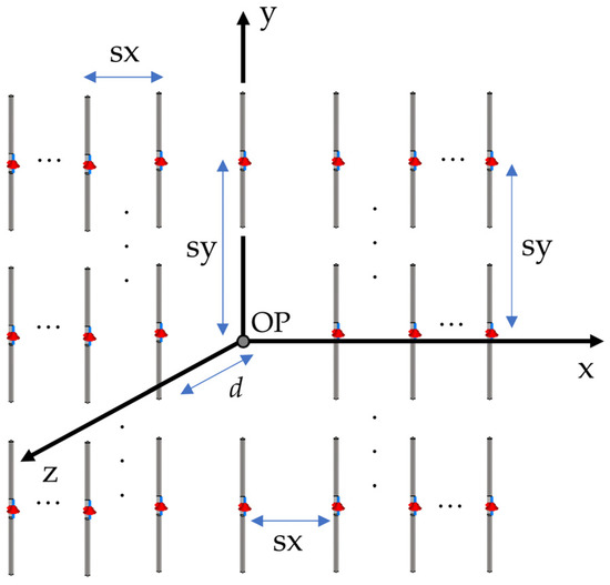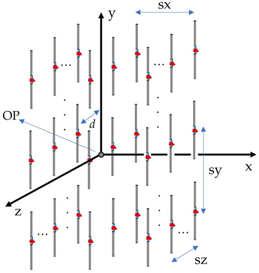 In the third configuration, the EMI sources are placed in a three-dimensional distribution (similar to the configuration in [6]), as shown in Figure 13. The distances between two successive elements in the x, y, and z directions are defined by sx, sy, and sz, respectively. The orientation of each element in the array can be selected arbitrarily by choosing the rotation angles around the x-, y-, and z-axes. The radiated emissions from the multiple EMI sources placed in a three-dimensional array are calculated at the OP, located at the center of the coordinate system, as shown in Figure 13. Note that in the three-dimensional distribution array, the first plane including sources is located at z = d.