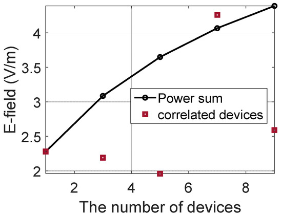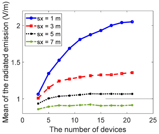 According to the first column of Table 2, the radiated emissions at a distance of 3 m for a single dipole antenna at 1 GHz is 2.28 V/m. Increasing the number of devices to three and five does not lead to an increase in the total in-phase radiated emissions. For example, for three devices, the radiated emission level is 2.19 V/m, which is lower than the emissions associated with a single piece of equipment under test (EUT). This result is opposite to the results presented by Haberlin [6]. In [6], increasing the number of radiative elements increases the radiated emissions. This is because the actual pattern of the dipole antenna is considered in our work with its phase varied by the term exp(-jkR), where j, k, and R are the complex imaginary number, the wavenumber, and the distance, respectively. This means that the different distances to the observation point from each device can lead to different phases, and therefore, to constructive or destructive interference, thus changing the level of the overall radiated emission. This shows how the radiation pattern and the location of the considered devices affect the far-field radiated emission.