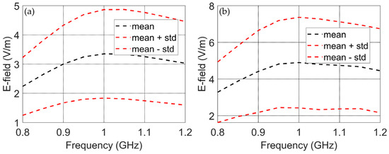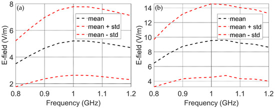 The second column of Table 2 presents the statistical values (mean value and standard deviation) obtained from Monte Carlo simulations [21,22] with 1000 samples with random phases. It can be seen that both the mean value and the standard deviation increased when the number of devices increases from one to nine elements. Figure 15a,b show the mean value and standard deviation of the radiated emissions for three and nine uncorrelated devices, respectively, in the frequency range from 0.8 to 1.2 GHz. In these figures, the central black lines are the mean values and the upper and lower red dashed lines show the mean value plus and minus one standard deviation. Figure S7a,b show the radiated emissions for three and nine uncorrelated devices, respectively, in the frequency range from 0.8 to 1.2 GHz for 1000 Monte Carlo simulations.